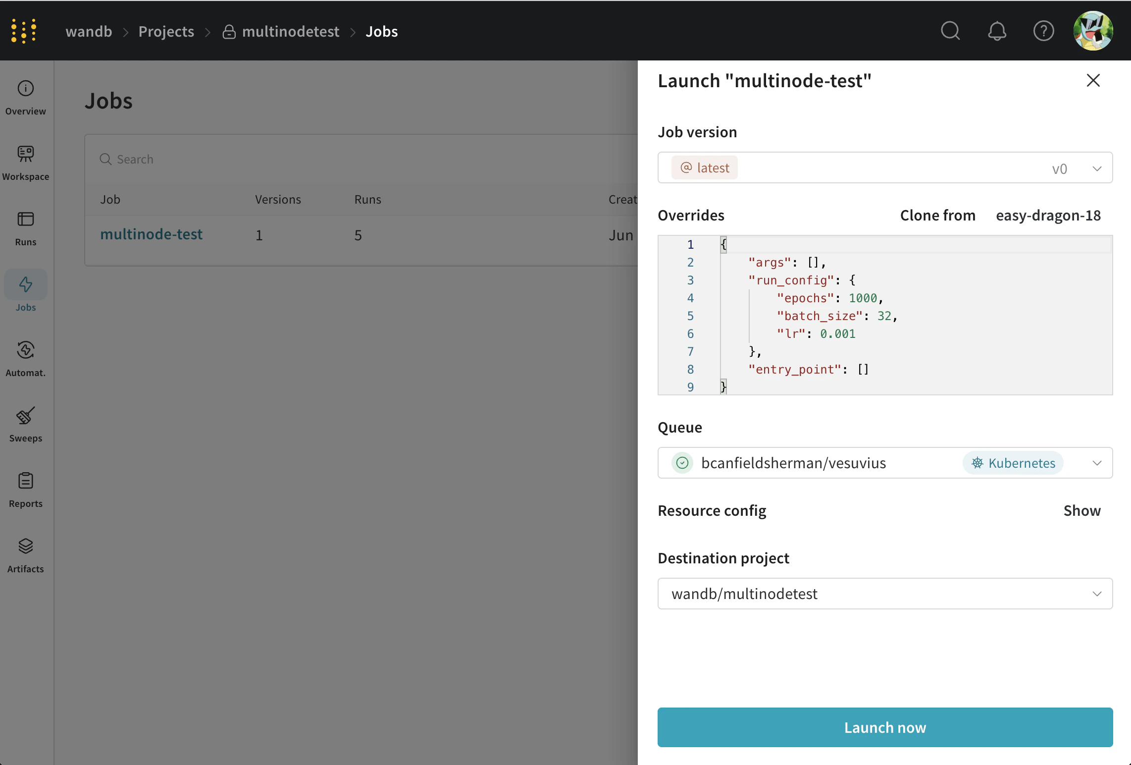 キューを作成したので、キューからジョブを取得して実行するための Launch エージェントをデプロイする必要があります。最も簡単な方法は、W&B 公式のhelm-charts リポジトリにある launch-agent チャート を使用することです。README の指示に従って Kubernetes クラスターにチャートをインストールし、エージェントが先ほど作成したキューをポーリングするように設定してください。